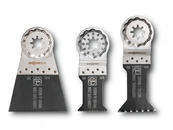 •E-Cut Sägeblatt Combo Zusammenstellung der 3 wichtigsten FEIN E-Cut Sägeblätter für den universellen Einsatz. Preisvorteil gegenüber Einzelbezug. Für alle Säge-Anwendungen perfekt ausgestattet. Lieferumfang: je 1 E-Cut Long-Life Sägeblatt 35 mm und 65 mm breit und 1 E-Cut Universal-Sägeblatt 44 mm breit