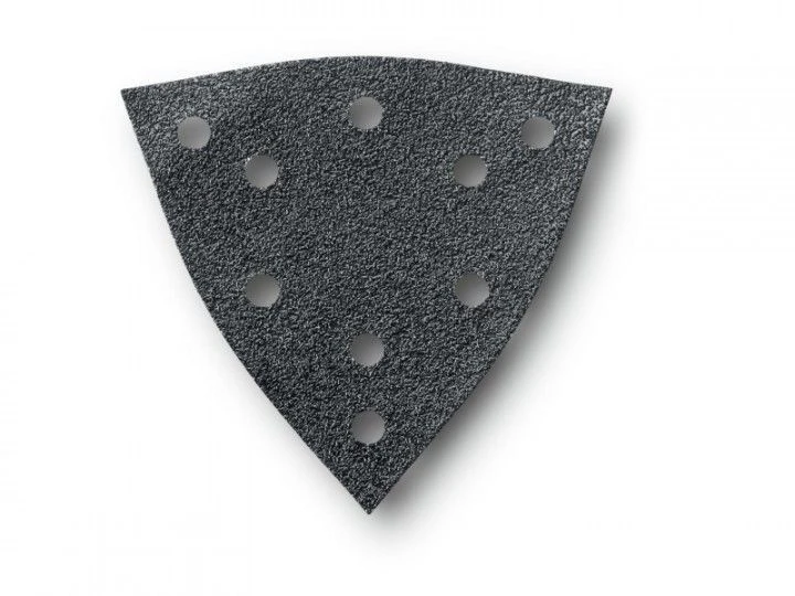•Schleifblätter, gelocht Passend zur großen Dreiecks-Schleifplatte mit Kantenlänge 130 mm. Korund-Schleifkörner und Vollkunstharzbindung garantieren hohe Abtragsleistung, geringes Zusetzen und hohe Standzeit. Für den universellen Einsatz auf nahezu allen Materialien. Gelocht, für den Einsatz mit gelochter Schleifplatte und Staubabsaugung, Klettenschnellbefestigung